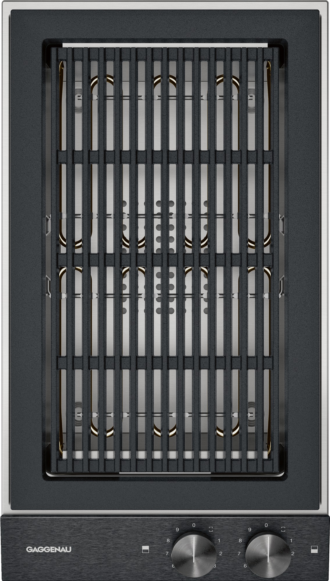 Gaggenau VR230120 — электрический гриль с двумя зонами нагрева. Каждая имеет независимую регулировку мощности. В комплект входят лоток из нержавеющей стали с лавакамнями и поддон для жира, которые можно мыть в посудомоечной машине. Обе конфорки оснащены индикаторами остаточного тепла, обеспечивающими безопасность эксплуатации.